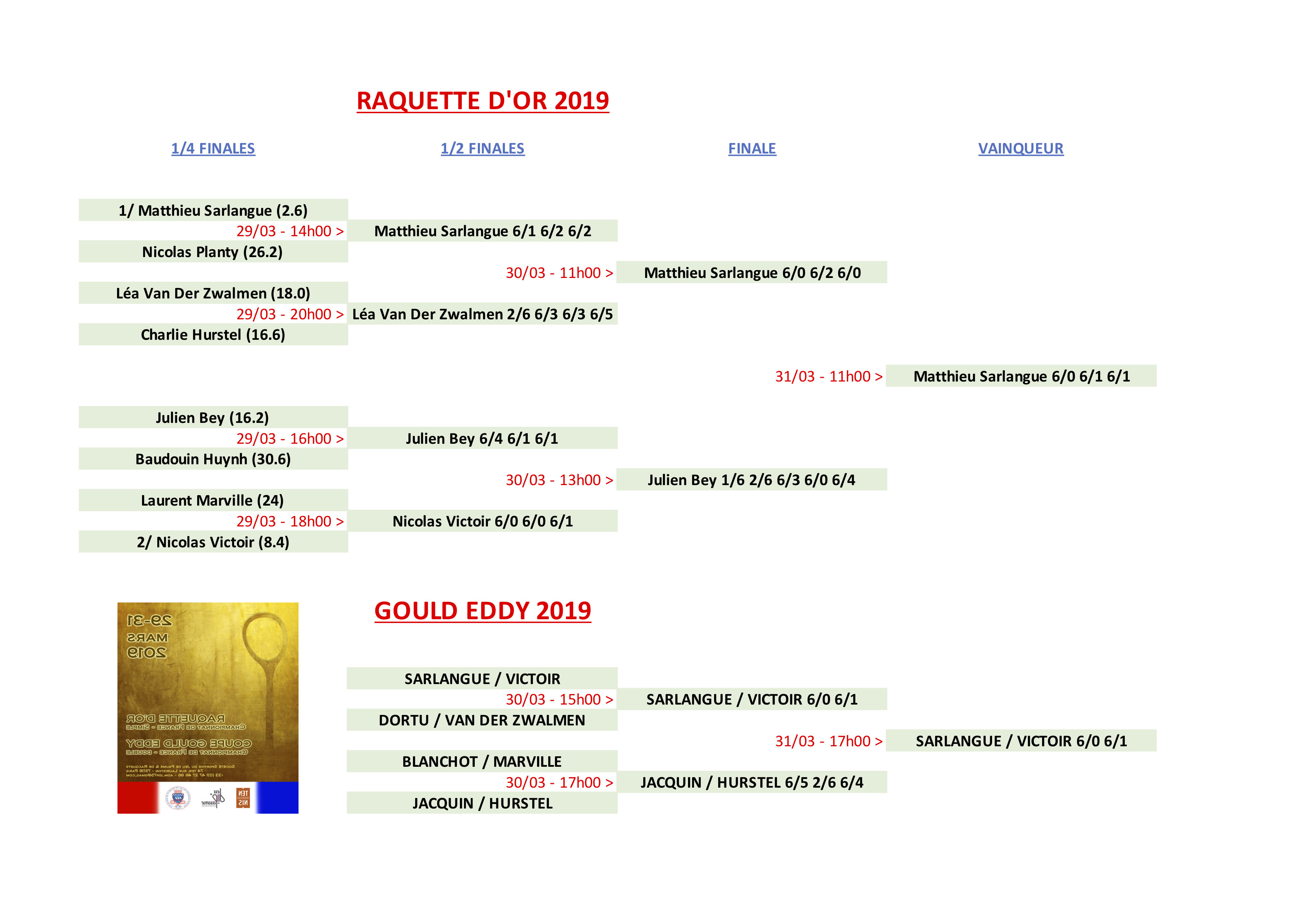 Raquette d'Or et à la Gould Eddy (tournoi de doubles) le WE du 29, 30 et 31 mars au JDP de Paris.